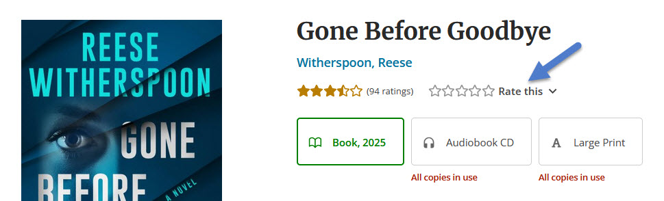 - Below the author’s last name and title, you will see available ratings and 5 grey stars. Click “Rate this” and select the number of stars out of 5 to add your rating. This will save your star rating and add the item to your Completed Shelf.