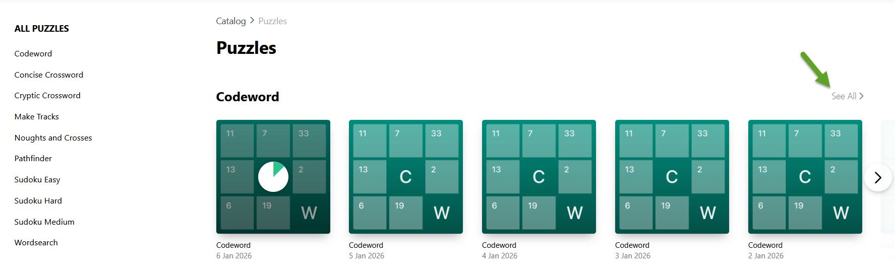 The 10 puzzles you can play online are Codeword, Concise Crosswords, Cryptic Crossword, Make Tracks, Nought and Crosses, Pathfinder, Sudoku (3 difficulty levels), and Wordsearch.