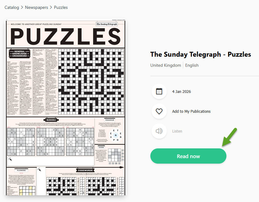 - Type "puzzles" in the PressReader search box, and click on Puzzles in the 'Publications' search result. You will see the latest section of The Sunday Telegraph - Puzzles.