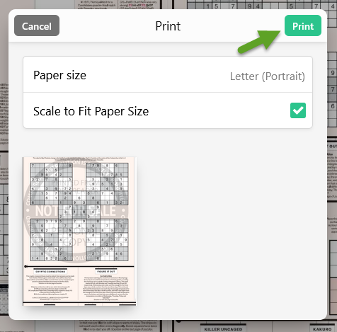 - Once you have set the print area, click the green print button in the top-right corner of your screen. In the Print pop-up window, you'll see a preview of the print area. To print the largest puzzle possible, select Scale to Fit Paper Size.