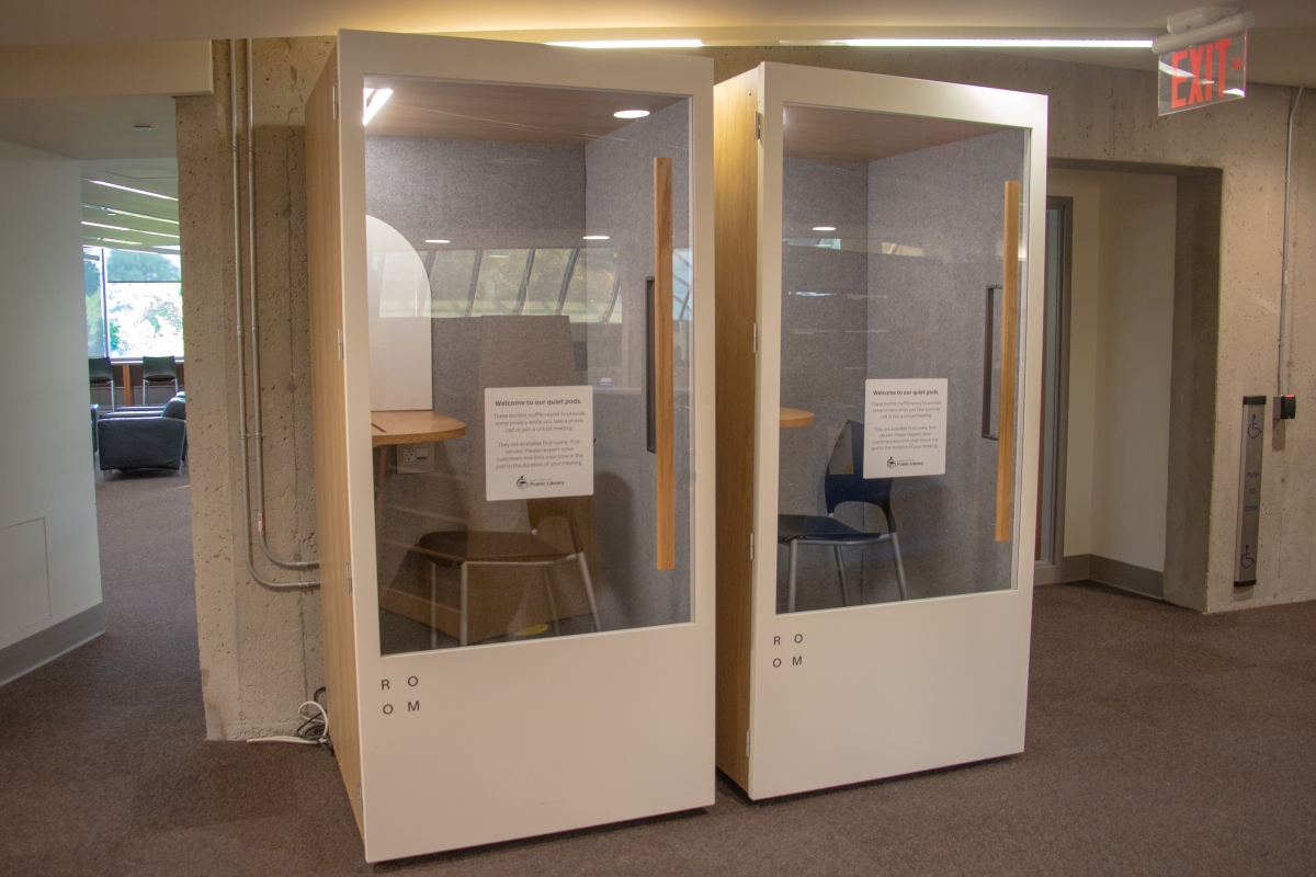 Burlington Public Library provides free private work areas seating at three branches: Central, New Appleby, and Tansley Woods. Learn how to book a space for small group meetings, quiet work, or study. Each space has limited seating, ranging from single-person pods to rooms for up to eight people.