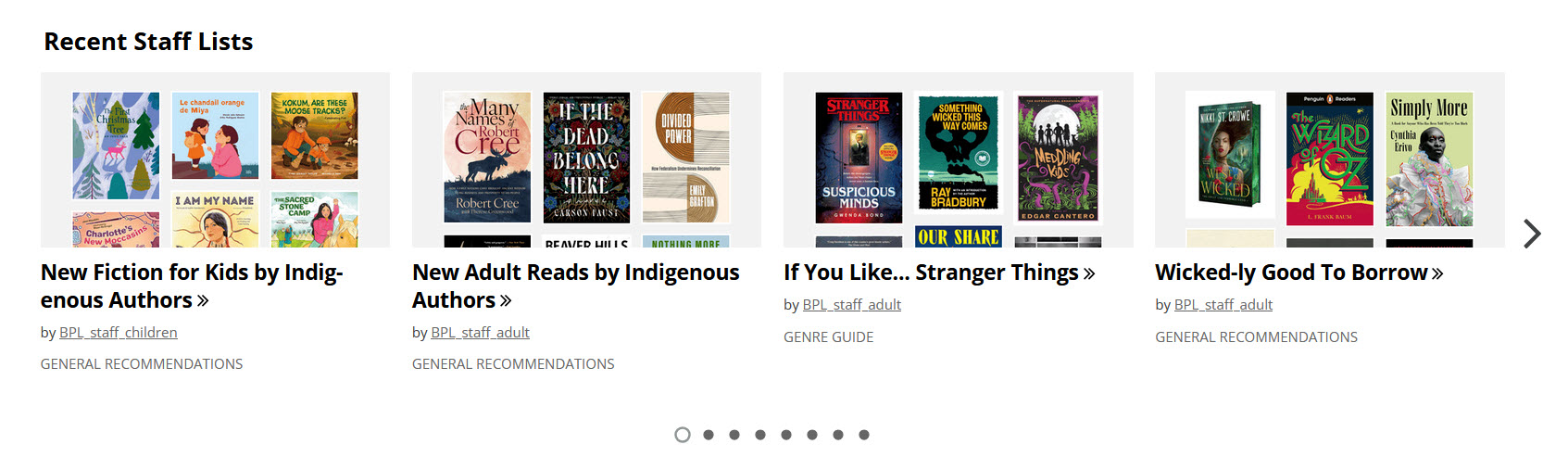 Keep scrolling down the catalogue home page to find a “Recent Lists” section. Here you’ll discover customer-curated lists, as well as staff lists. You can tell who the author of the list is by the username. Staff lists include “BPL_staff” in the username, while customer lists do not.
