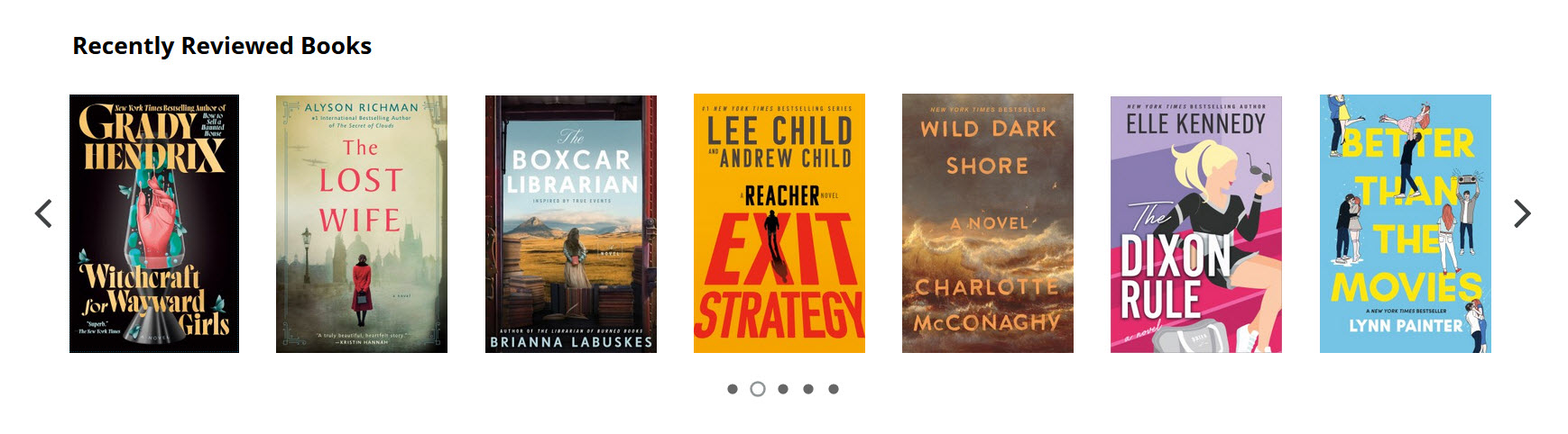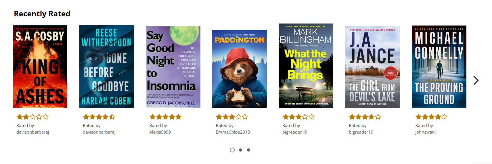 This section spotlights recently reviewed books, DVDs, and CDs. These ratings are by library users like you and are a great way to check out opinions on an item before borrowing it yourself. Take a look at some reviews and add your own!